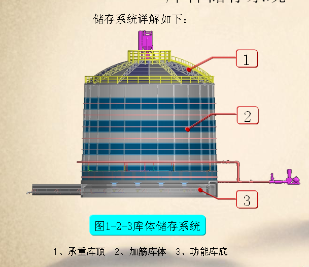 储存系统主要有库顶、库体及库底三部分组成。库顶采用先进的空间受力结构,该结构有空间钢度强、抗震性能好、施工周期短、节省材料等优点。库体采用钢板搭接,横纵向加筋技术,确保库体100%安全系数。库底采用锲力增压蝶形基础能很好增强基础下方岩土的地耐力以达到库体的承载要求。